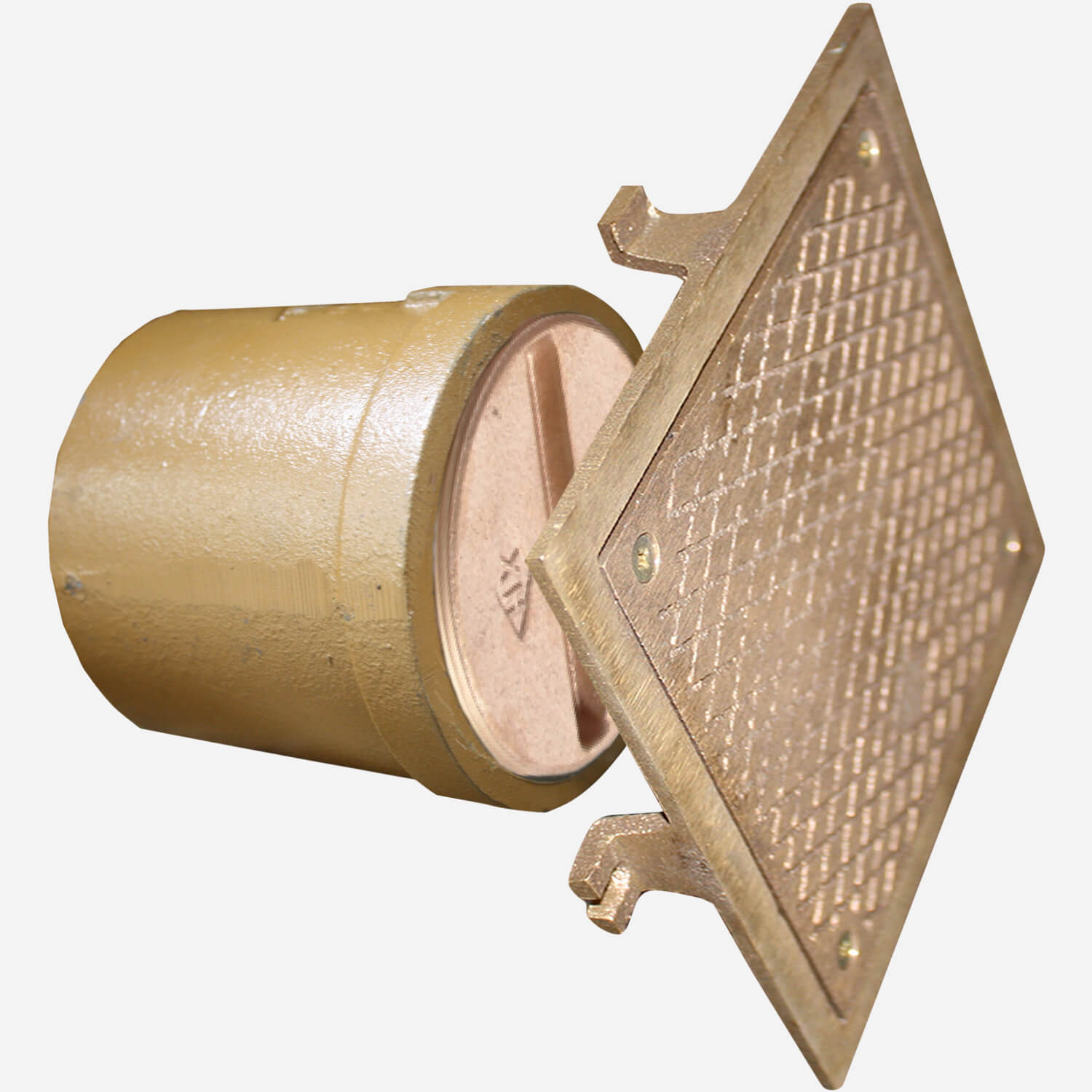 This cast bronze taper thread closure plug is used in caulk ferrule cleanouts that require a taper thread plug. This plug can be covered with one of two frames having secured scoriated covers. Fig. 4440 is a circular cover designed for face-of-wall installation in tile, masonry, or dry wall construction. It is usually installed on an opening in the finished wall. Fig. 4441 is a square cover intended for flush-with-wall installation in plaster or wet wall construction and is installed during the wall construction. Both are fitted with anchoring lugs that secure the frame to the wall.