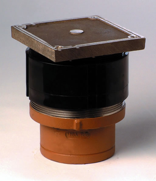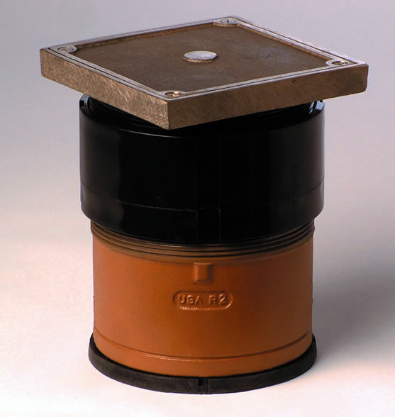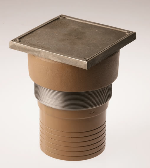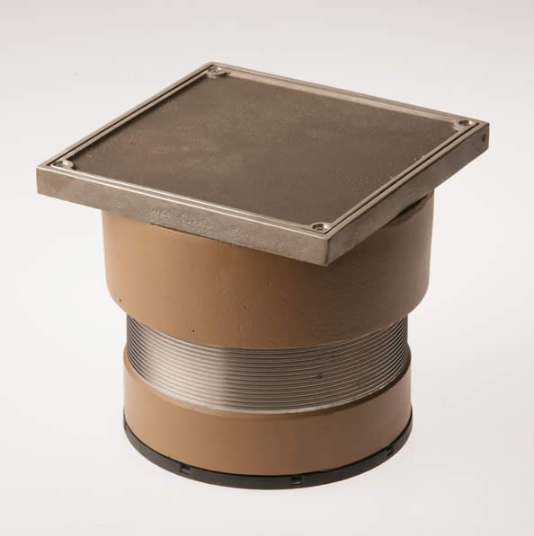 This labor saving cleanout uses our Twis-to-Floor® adjustment technology to level the top with adjacent surfaces after the floor is poured and floor coverings such as asphalt, vinyl tile or linoleum are installed. Its 6” (150) square nickel bronze top is recessed 1/8” (3) to receive an inlay of the floor material for an unobtrusive appearance. Constructed of Duco coated cast iron, this cleanout is designed to support foot and medium load wheeled traffic. It is available with 2", 3" and 4" outlets.