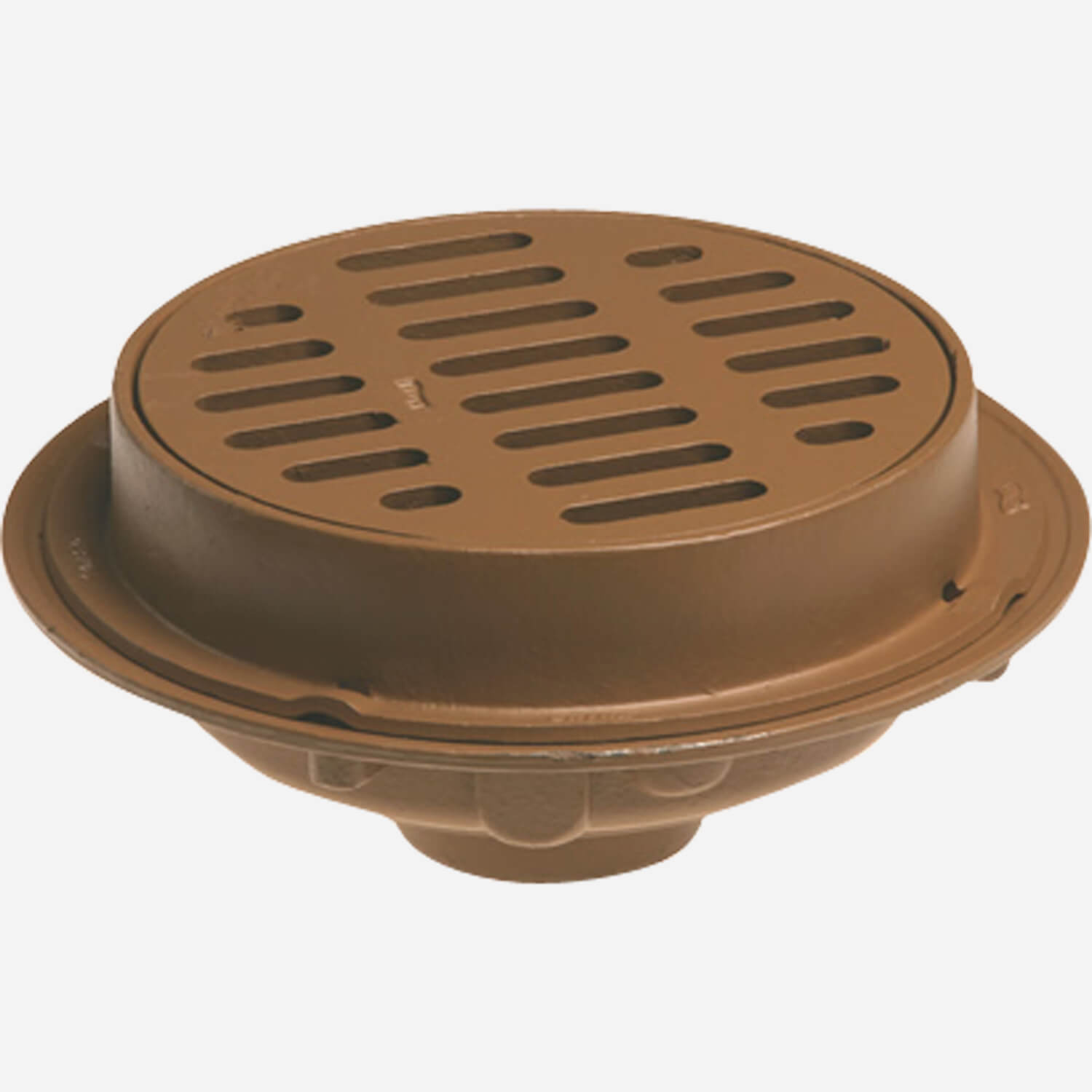 Designed to facilitate cleanout in medium trucking areas where wastewater debris must be prevented from entering the drainage system. A handle is provided so the sediment bucket can be easily lifted through this floor drain's large 12" diam. grate. This medium duty drain and tractor grate is made of Duco cast iron. Other configurations are available.