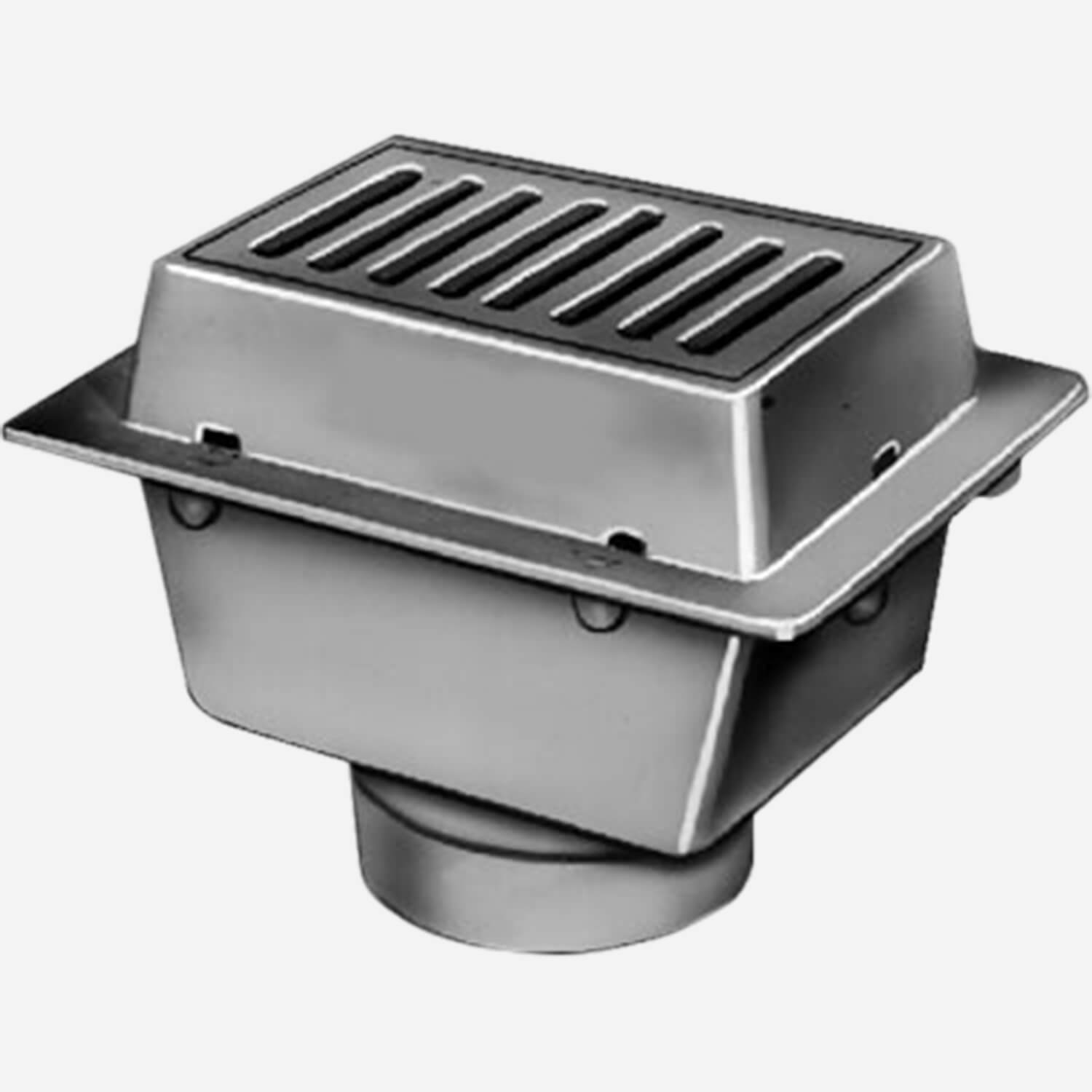 This 12" by 9" rectangular drain is engineered to transport debris-filled wastewater from narrow spaces like gutters and trenches. Its protective sediment bucket is easily accessible through this Duco cast iron drain's hinged grate and has a convenient lift bar for fast retrieval and replacement. A flashing clamp can be specified if needed.