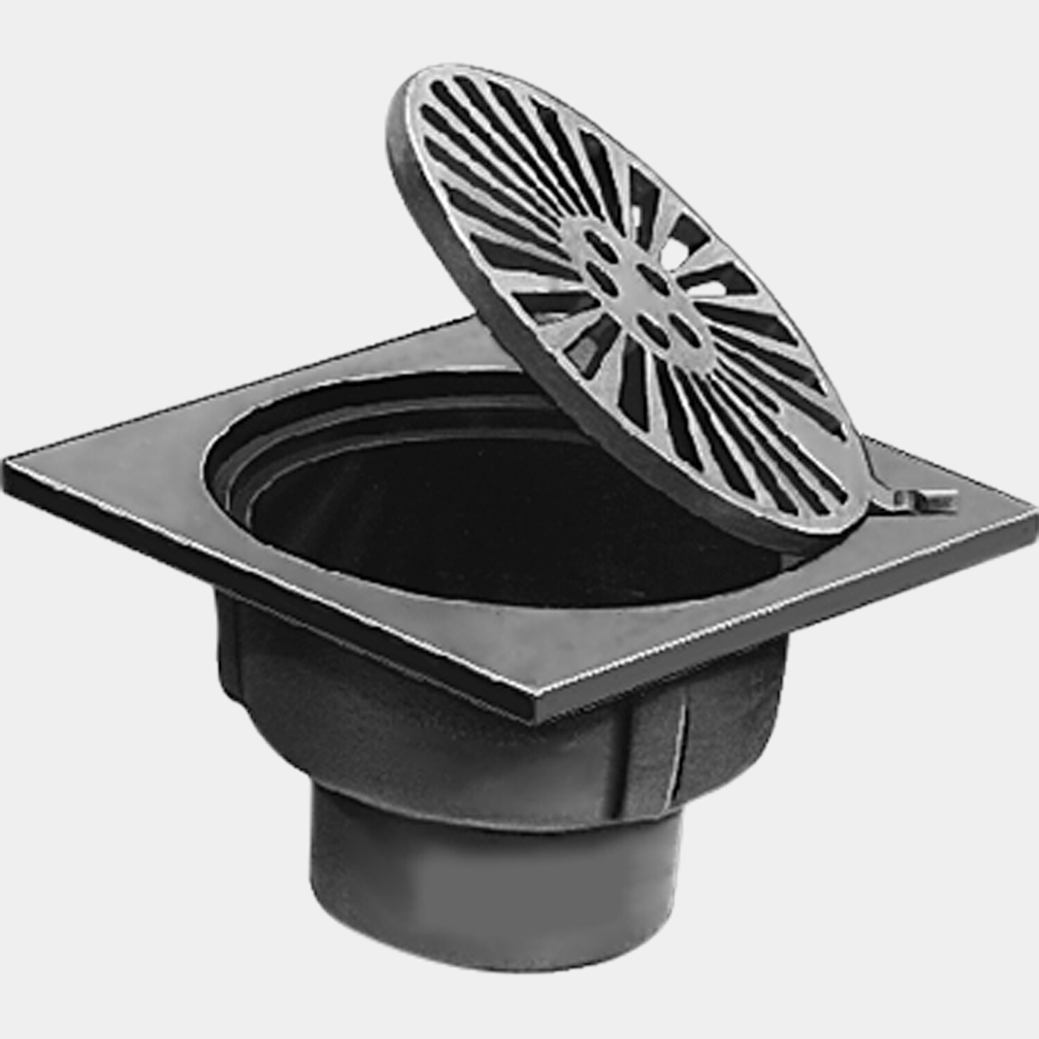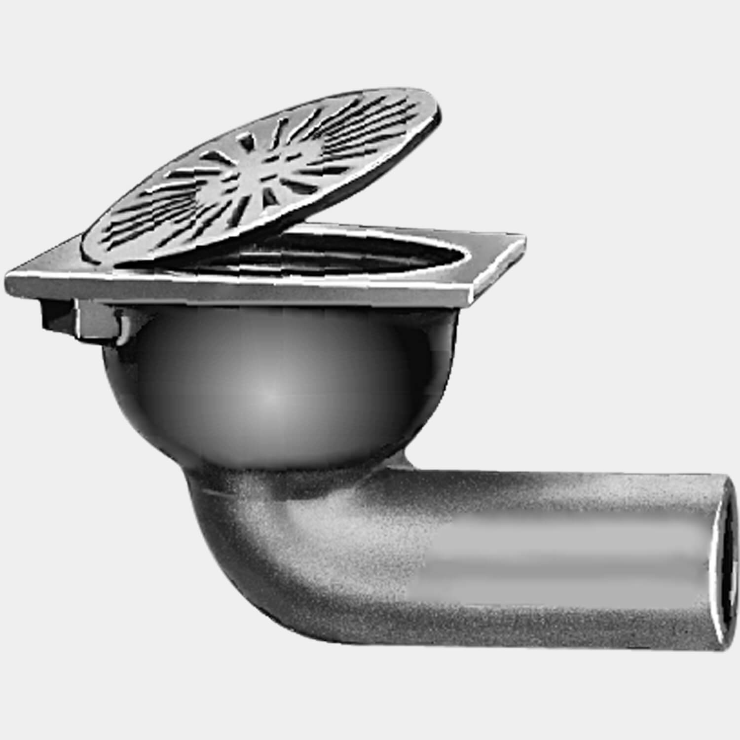 This light duty, Duco cast iron floor drain is engineered for installation on-grade and can support loads of less than 2,000 lbs. (900kg.). It is fitted with a 7.5" diam. slotted cast iron grate that is hinged to a 10"square top plate eliminating potential loss of the grate and preventing tripping and other hazards.