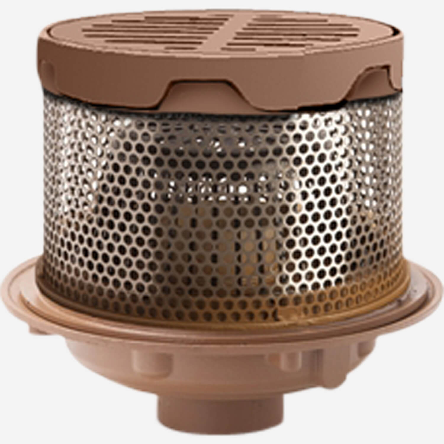 Designed for large planters, this 8.5" diam. Duco coated cast iron drain protects drain lines with a dome bottom strainer set inside a stainless steel gravel stop/top extender that is covered by an anti-tilt, slotted, cast iron grate.