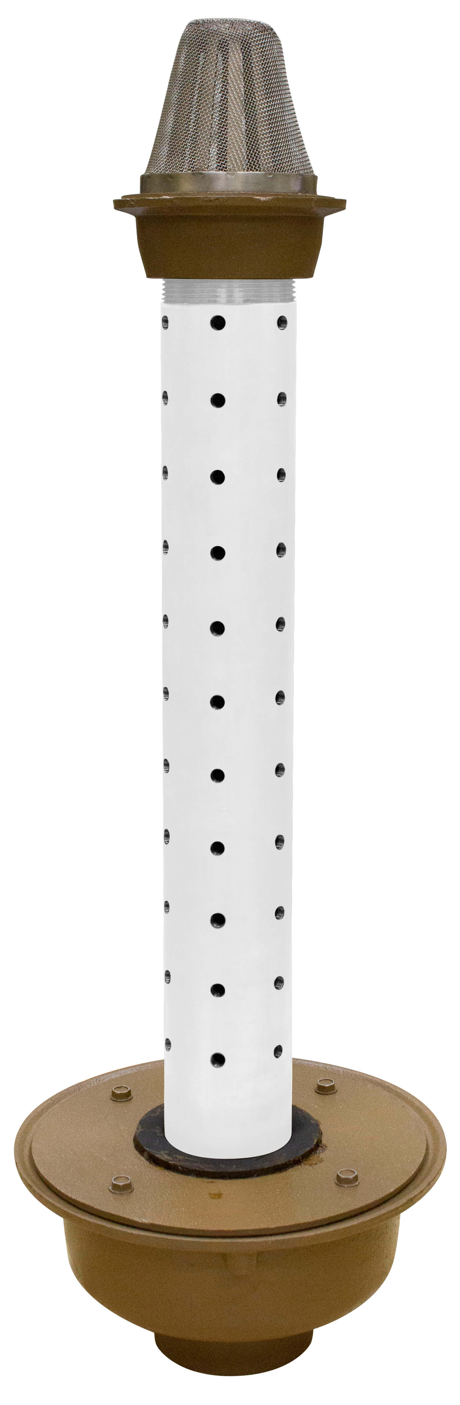 Engineered for installation in growing medium on green roof systems, a 6" diam. stainless steel mesh covered receptacle collects drainage at ground level atop a sturdy 3" diam. perforated PVC standpipe. The standpipe channels drainage to a 12" diameter corrosion resistant, Duco coated cast iron drain installed in roof decking while extracting excess moisture from the surrounding growing medium ensuring optimal growing conditions for rooftop plantings.