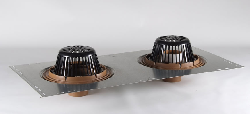 Engineered to save installation costs, the roof and overflow drains of this unit are securely attached to a single deck plate. This permits both drains to be secured to the roof deck from above the roof, eliminates the need for an underdeck clamp, and requires only one roof penetration. The drains are constructed of Duco coated cast iron. The roof drain has a combined flashing clamp and gravel stop. The overflow drain is fitted with a combined flashing clamp and 2” water dam. Both drains are protected by polyethylene dome strainers.