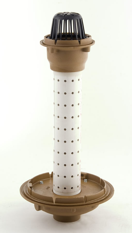 Designed for sub-surface installation in multi-level planting areas of green roof systems, this 15 1/4" diam. duco cast iron drain protects roof decking while a 8 1/2" diam. surface level drain with gravel-stop dome sits above-ground atop a 4" diam. perforated PVC standpipe that supports optimal vegetation growth.