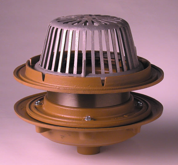 This general purpose drain is adjustable on-site to accommodate roofs of any construction between 1-1/4" (32) and 4" (100) thick with up to 2-3/4" (70) of insulation. The combination flange clamp and gravel stop of this 15-1/4" (390) diam. adjustable roof drain spins around a threaded extension sleeve to conform to varying roof thicknesses. The drain body and flange assembly are made of Duco coated cast iron. It is protected by a polyethylene dome strainer.