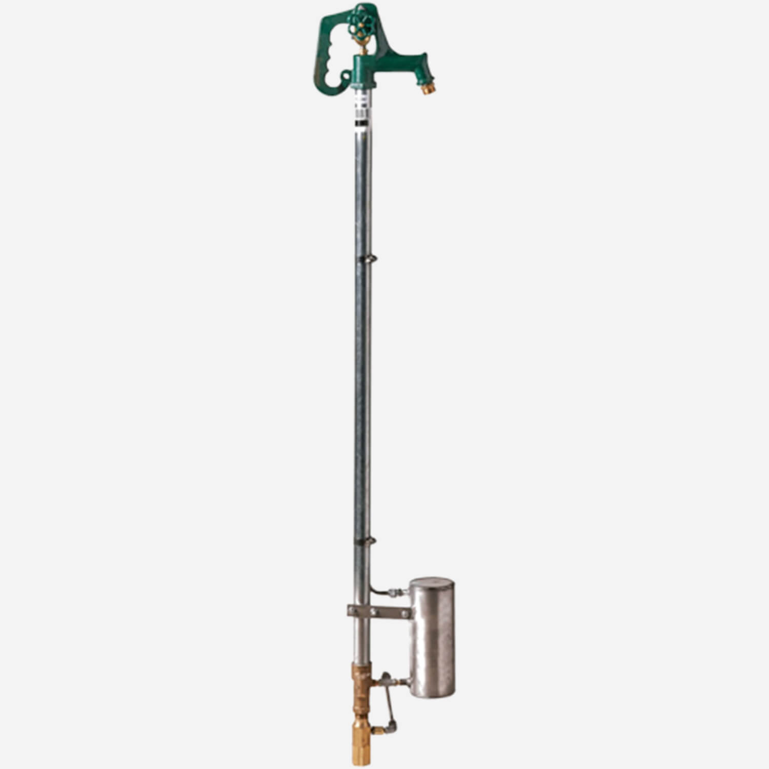 For freeze-resistant reliability in all climates where water must not drain from within the hydrant into the ground, the valve and 3/4" brass inlet of this post hydrant is positioned below the frost line. Clean water is channeled to the hydrant's above ground cast iron head and 3/4" hose connection through a rugged galvanized pipe. After use, the galvanized pipe drains into a sealed stainless steel canister protecting the pipe from bursting system water safe from contamination. All working parts are field serviceable and easily accessed from the top of the hydrant.
