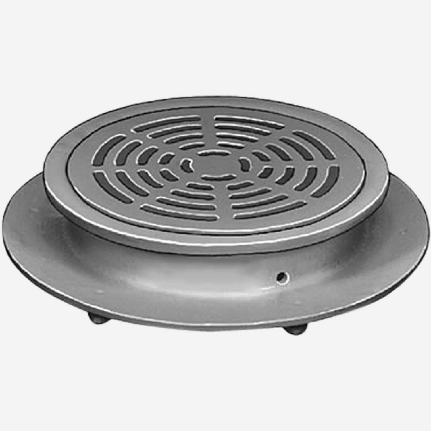 Engineered for long service life in food handling facilities, schools, and hospitals away from foot or other traffic, this 12” diam. Sani-ceptor® cast iron floor drain is specially coated for acid resistance where the highest standard of sanitation is required. The shallow, medium capacity drain body is has an integral flange which accepts an optional flashing clamp permitting it to be installed in many types of construction. This drain is covered by a loose set grate and is available with an aluminum dome bottom strainer (fig. 3402) or sediment bucket (fig. 3412) that keep drain lines debris free.