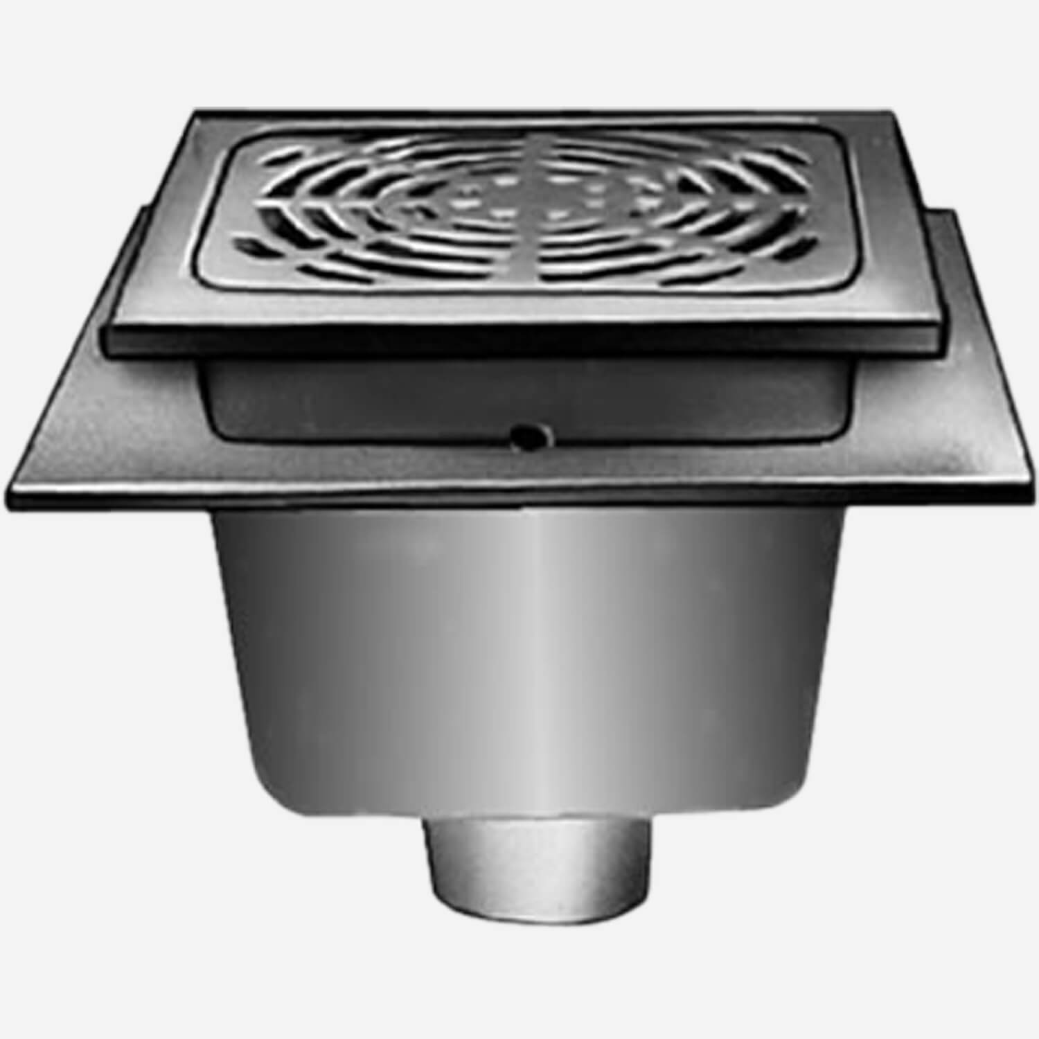 Engineered for long service life in food handling facilities, schools, and hospitals away from foot or other traffic, this 12” square Sani-Ceptor® cast iron floor drain is specially coated for acid resistance where the highest standard of sanitation is required. The medium 6” (150), deep 8” (205) and extra deep 10” (255). capacity drain bodies have an integral flange which can accept an optional flashing clamp permitting them to be installed in many types of construction. This drain is covered by a loose set grate and is available with an aluminum dome bottom strainer or white ABS sediment bucket to keep drain lines debris free.