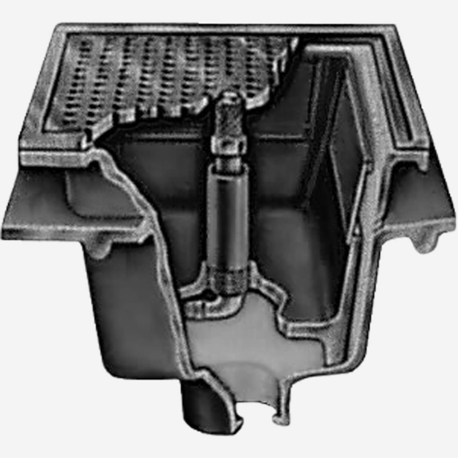 Our exclusive 12-1/2" square Sani-Ceptor® Can Washing Floor Drain is fitted with a "single orifice" spray nozzle that can be set from driving fine mist to solid stream to scour waste thoroughly can interiors. This unique drain's durable cast iron receptacle is specially coated for abrasion and chemical attack. Waste solids are kept from entering drain lines by a free-standing aluminum sediment bucket just below the drain corrosion-resistant nickel bronze rim and grate.