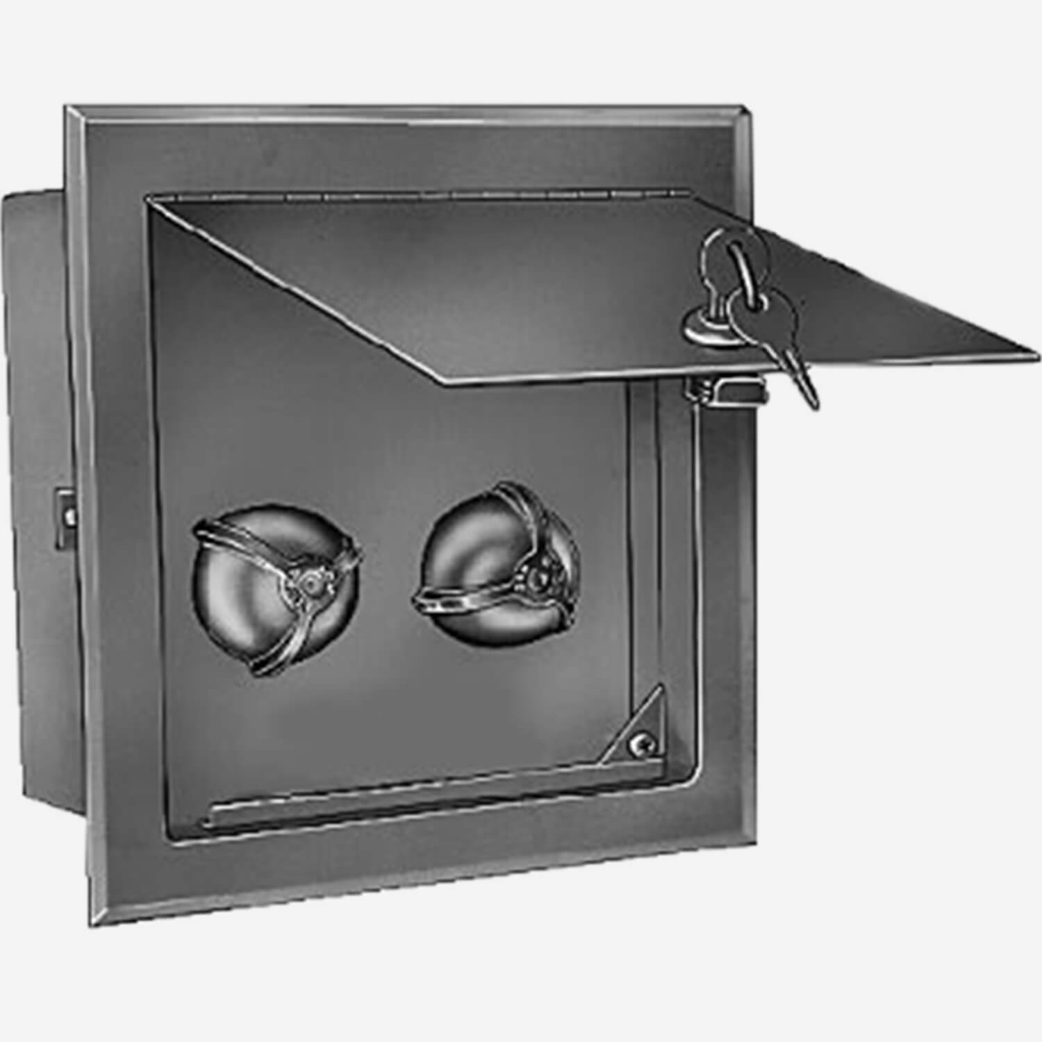 Water Supply Control Box permits access to the valve controls for the JR Smith Can Washing Drain (Figure 3370) in a vandal resistant stainless steel enclosure with a hinged door and cylinder lock. Inside the box, an integral vacuum breaker protects system hot and cold potable water supplies. The hot and cold water supplies are provided with integral screw driver stops allowing maintenance of the control valves without shutting down the main water supply.