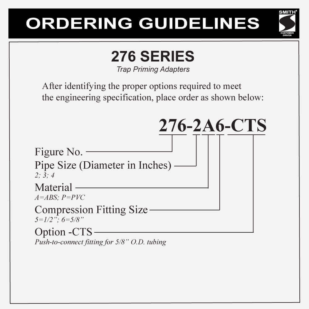 ABS or PVC Trap Primer Adapter Fitting as seletected providing a 360º adjustment prior to permanent installation, a 1/2" or 5/8" brass compression fitting as selected is provided with each adapter for the connection to a trap priming line from a trap primer valve.