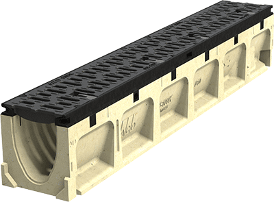 These 6" wide, pre-sloped, polymer concrete, trench drains with extra heavy duty integral ductile iron rails are appropriate for all surface drainage applications. The convenient interlocking design reduces installation time and cost. ideal applications include warehousing, bottling plants, industrial plants, loading docks, fire stations, military bases, highways, airports, and hangers.
