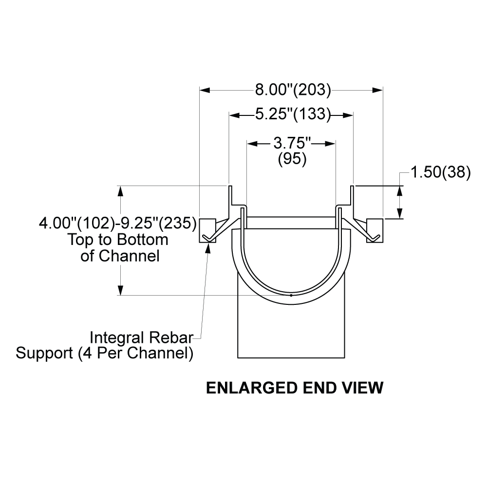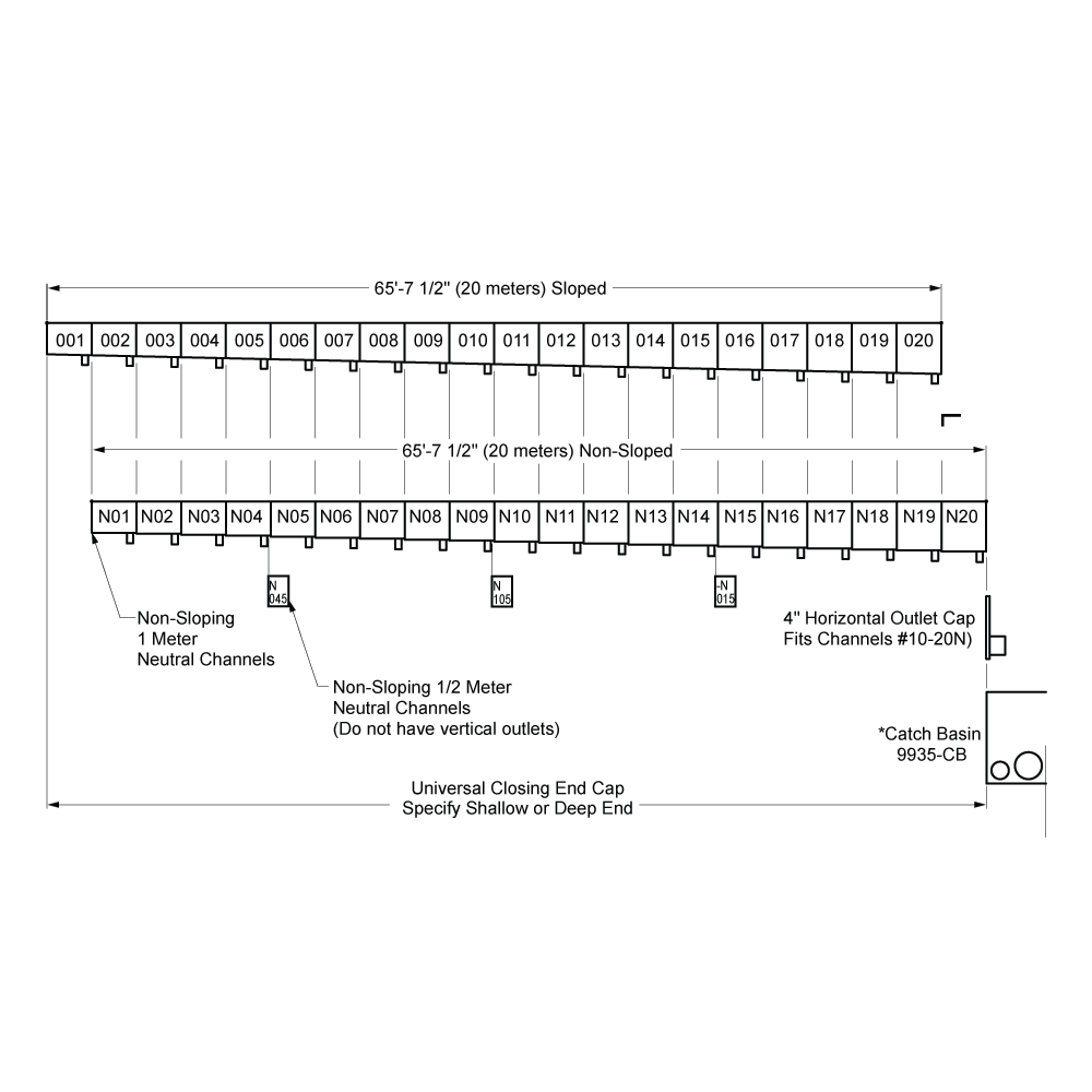 | Variations | Closing End Cap Shallow -ES, Closing End Cap Deep -ED, Horizontal Outlet 4" -H4, Catch Basin Only 9935-20, Catch Basin Plastic Bucket -BP, Direction Change Coupling -MC, Stainless Steel Overlay Rails -SSR, 9849 Rante Arrow, 4" NO-HUB Bottom Outlet Adaptor -BO, (2) 3/8” (10) Tappings -TAP |