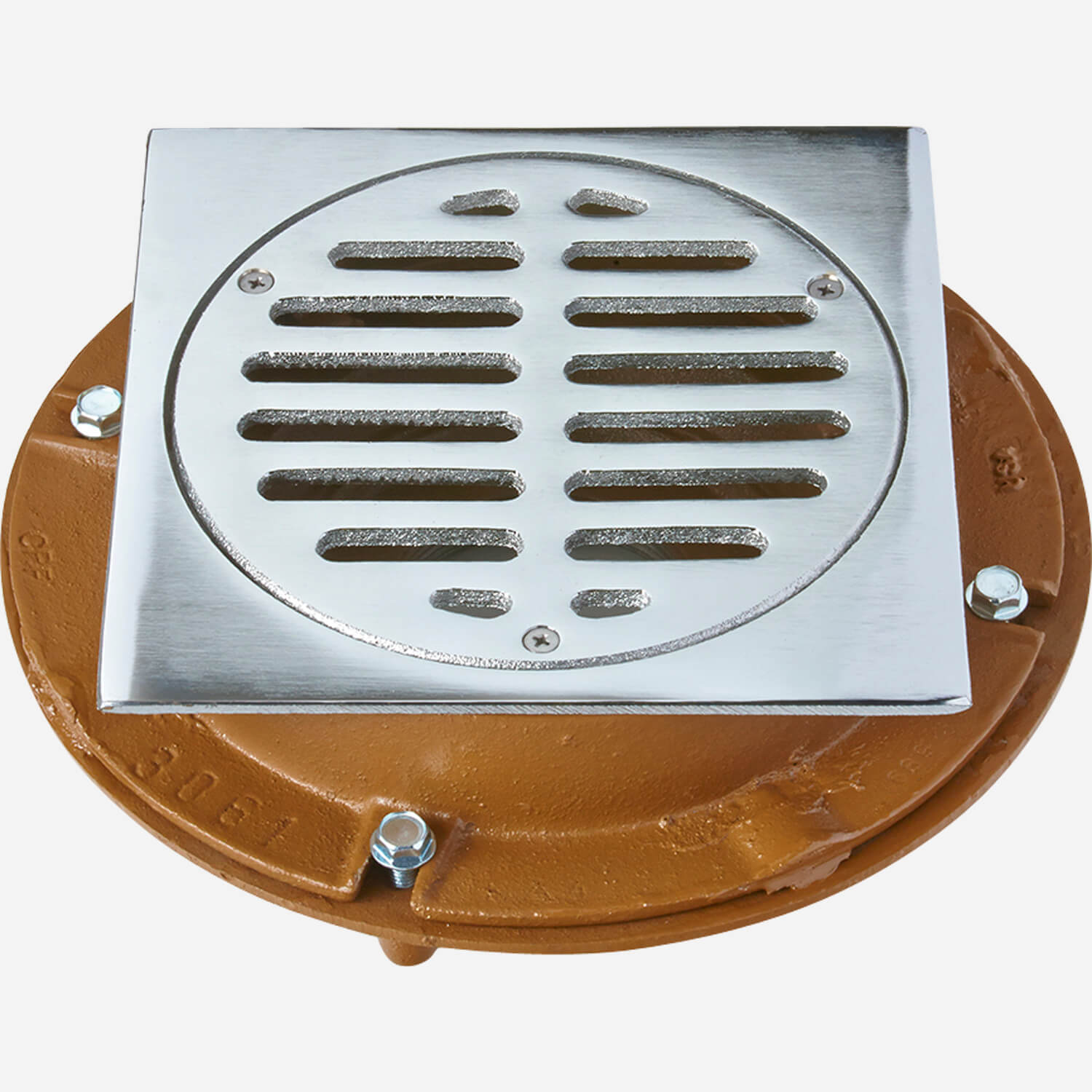 Figure 6010 special purpose drain is available with a 2", 3", 4" Bottom Outlet Connection. It has a cast iron body and anchor flange with secured chrome plated bronze grate and frame. Threaded and caulk connection options are available.