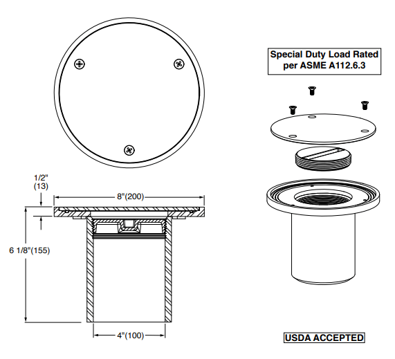 The secured 8” (200) solid top of our 9649 Cleanout covers a threaded 4” (100) slotted closure plug with a spigot connection. All parts are fabricated entirely of Type 304 Stainless Steel with the exception of an O-Ring that lines the cover and ensures a tight waterproof seal.