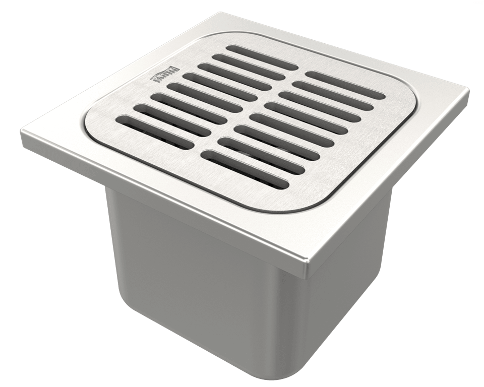 Our square top 9642 and 1943 model drains are installed as general purpose, medium duty floor drains and as indirect waste drains meant to catch liquids from an overhead outlet that it is not connected to. They are constructed of 14 gauge, Type 304 stainless steel and designed for environments that require consistently high levels of sanitation and fixture materials that durably withstand corrosive liquids (such as in food handling or chemical processing plants). A 6” sq. loose-set slotted stainless steel grate covers the drain and allows easy access for cleaning . A USDA compliant model is also available.