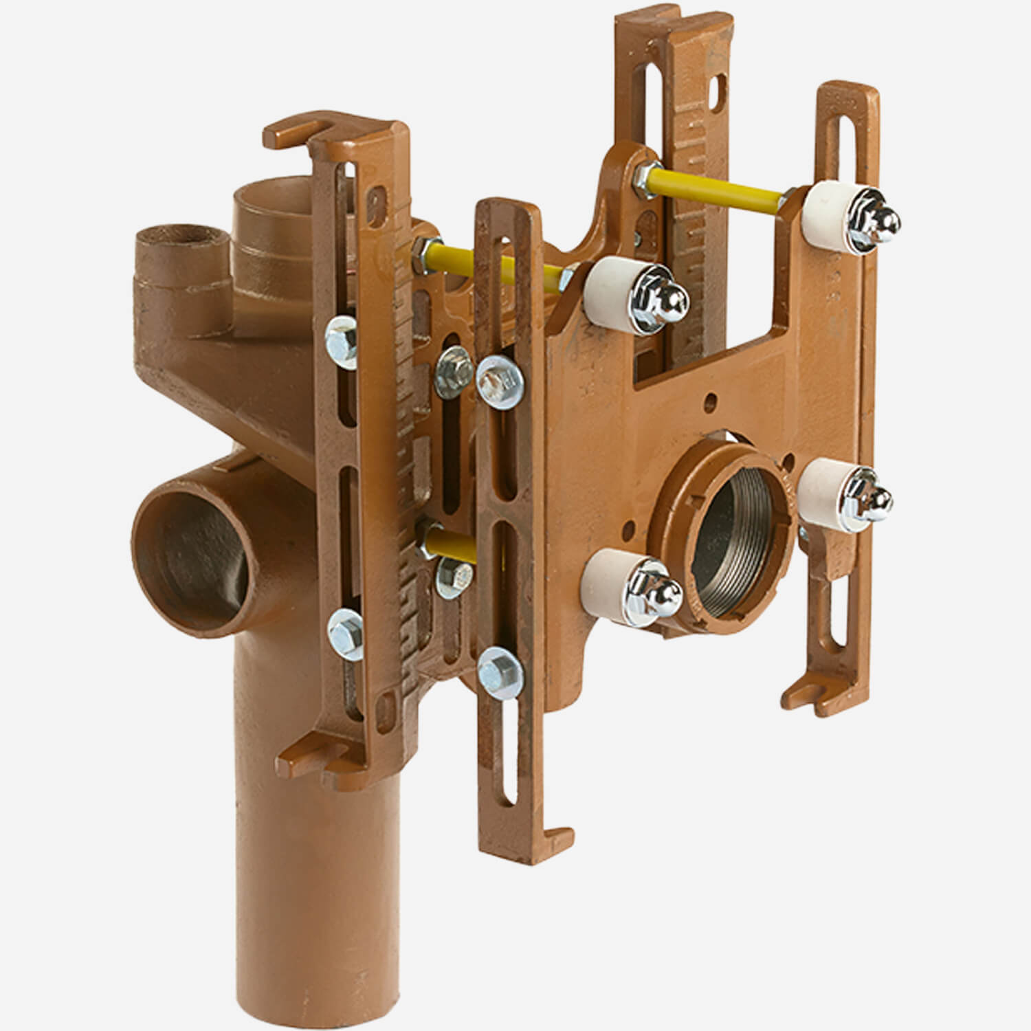 This contractor labor saving, shallow rough-in, adjustable fixture support for bariatric duty siphon jet water closets features no-hub vertical fittings with two side inlets. When installed correctly it is able to support a pull-out force of 1000 lbs (454 kg).
