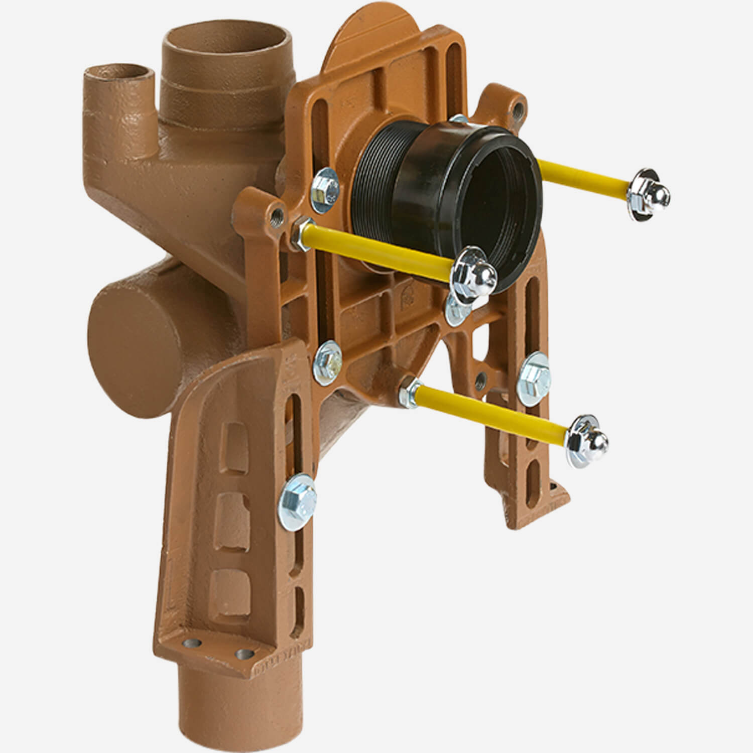 Adjustable, shallow rough-in, fixture supports for blowout water closets. Features no-hub vertical fitting.