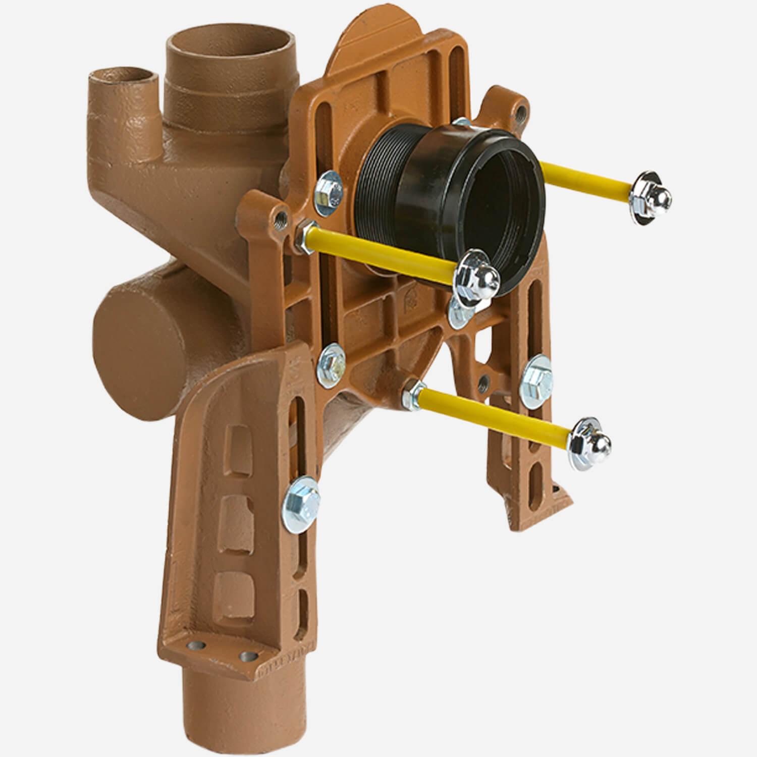 Adjustable, shallow rough-in, fixture supports for blowout water closets. Features no-hub vertical fitting with side inlet.